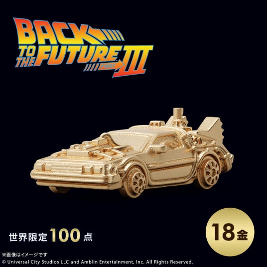 このたびの新作は、映画『バック・トゥ・ザ・フューチャー』シリーズとコラボレーションしたタイムマシンのミニフィギュアです。シリーズ3部作「Part1」「Part2」「Part3」それぞれの劇中に登場する「タイムマシン」を、ジュエリー職人が細部までこだわりK18イエローゴールドで再現しました。