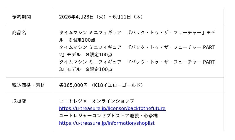 株式会社ユートレジャー(本社:東京都新宿区、代表取締役社長:青木 興一、株式会社ケイ・ウノの連結子会社)は、世界中で今もなお世代を超えて愛され続けている名作アドベンチャー映画『バック・トゥ・ザ・フューチャー』シリーズとコラボレーションした「タイムマシン ミニフィギュア」を2026年4月28日(火)~6月11日(木)の期間限定で予約受付を行います。各100体の数量限定です。