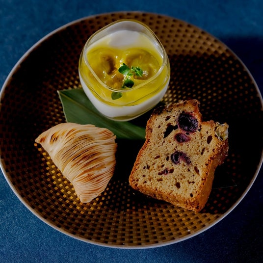 スイーツには、ピスタチオ生地にグリオットチェリーを混ぜ込んだ香り高いケークや、抹茶のバタークリームとレモンのガナッシュを重ね、抹茶の濃厚さの中に爽やかさを感じる「抹茶とレモンのオペラ」、マンゴーに木の芽を合わせた斬新な「マンゴーと木の芽のパブロバ」など、素材の組み合わせの妙が光る6種をご用意します。