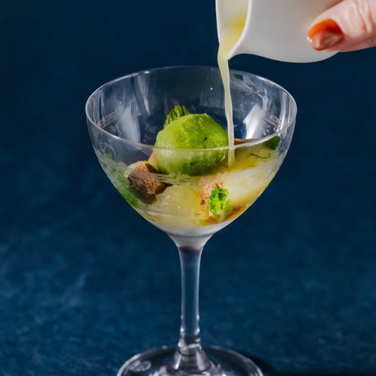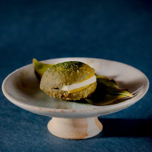 温かい一品には、よもぎを練り込んだブリオッシュを素揚げにし、あんことクリームチーズにレモンのアクセントを添えた一皿を。締めくくりには、ミントソルベとヨーグルトのクープにメロンスープを注いで仕上げる、清々しい余韻のデザートをお届けします。