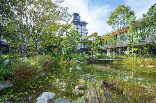 2020年4月に開業した複合施設です。水と緑豊かな約1万平方メートル の中央広場を中心に、最上階にインフィニティプールを有するホテル、多摩地区最大規模約2,500席の多機能ホール、ショップ・レストラン、オフィスなどが配置されています。