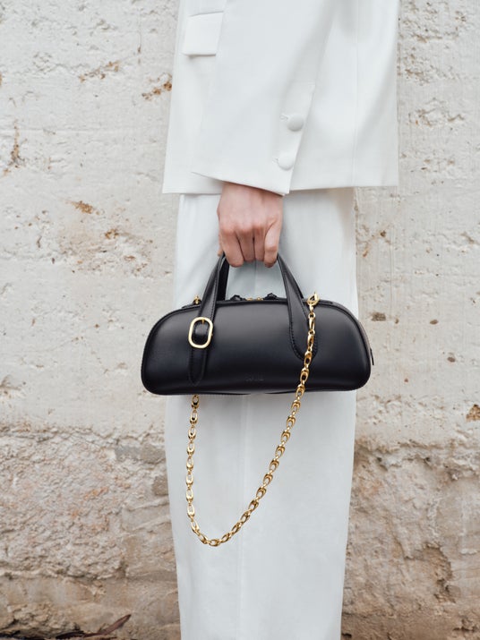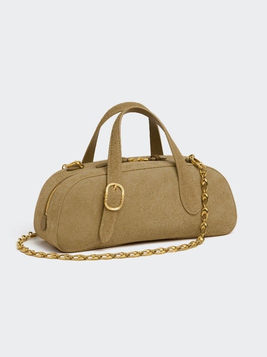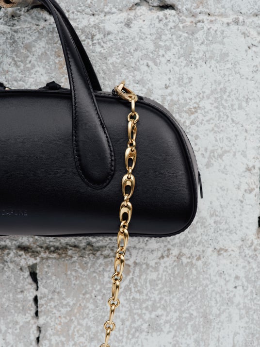 三日月型からインスパイアされたゴールドパーツを繋ぎ合わせたこのチェーンは、カジュアルの定番であるボストンバッグに、新鮮なコントラストをもたらします。市場でも珍しい「ボストンバッグxチェーン」の組み合わせは、実用的なバッグにジュエリーのような輝きと洗練さを添え、様々なシーンに映えるモダンアクセサリーへと昇華させてくれます。ミニマムながらも、スマートフォン、長財布、鍵などの必需品をしっかり収納でき、取り外し可能なチェーンでハンドバッグからショルダーへと、変幻自在に使えるフレキシブルさも魅力です。
