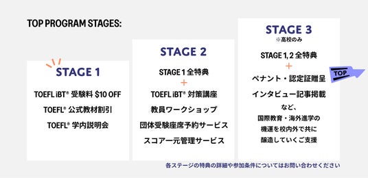 TOEFL iBT(R) Open Possibilities プログラム(通称:TOPプログラム)は、ETS Japanが2025年10月に創設した、グローバルに活躍できる人材育成を行う教育機関向けの特別プログラムです。プログラム参加校には、TOEFL iBT(R)の受験支援から教育現場のニーズに応じた柔軟なプログラム設計まで、STAGE1~3の段階的なサポートをすべて無料で提供。国際教育の推進とグローバル人材の育成を共に目指します。プログラムの詳細はTOEFLテスト日本事務局Webサイトをご確認ください。