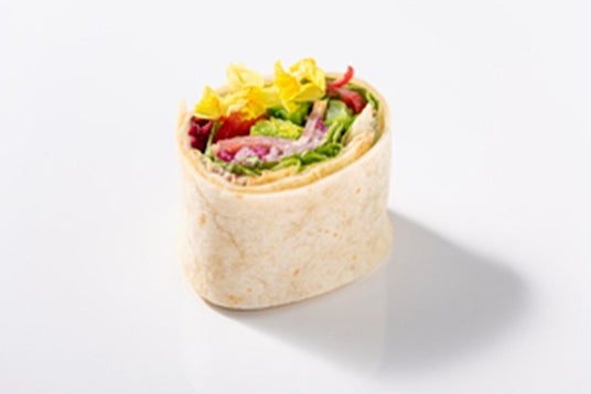 ベーコンやアメ―ラトマト、大根のマリネなどを巻いたほんのりスパイシーなトルティーヤ