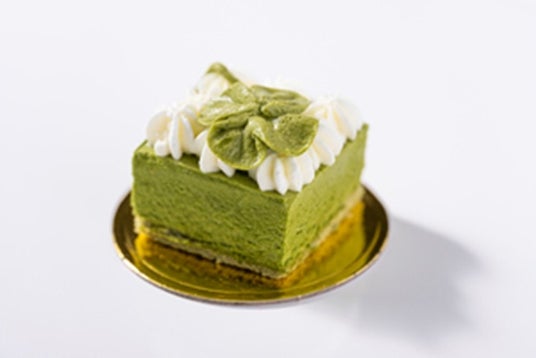 ムースでできた幸福の四つ葉をのせたほろ苦い抹茶ムース