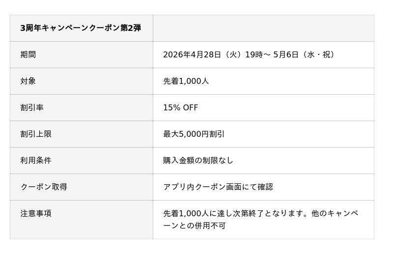 株式会社Myca(本社:茨城県つくば市、以下「Myca」)が運営するトレーディングカード管理アプリ「DMMマイカ(旧:Mycalinks)」は、2026年4月28日(火)より、3周年記念キャンペーン第2弾として、先着1,000名限定の15%割引クーポン(最大5,000円OFF)の配布を開始いたします。