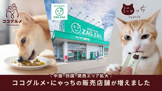 この度、中国・四国・関西エリアを中心に地域に根ざした店舗展開を行うドラッグストア「ザグザグ」さまにて、新たに100以上の店舗でお取り扱いを開始いただくこととなりました。該当地域にお住まいの愛犬家・愛猫家の方々にも、より日常生活に近い身近なお買い物の場で「ココグルメ」や「にゃっち」をお届けできると考えております。