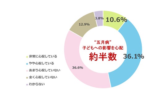 ゴールデンウィーク明けにおける子どもの学習意欲や生活リズムの乱れ(いわゆる“五月病”傾向)について心配しているか尋ねたところ、46.7%が「心配している」(非常に心配している:10.6%、やや心配している:36.1%)と回答しました。