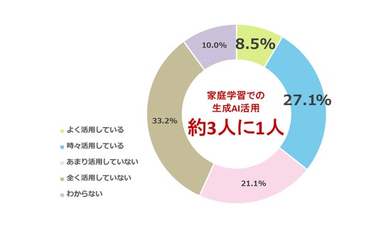 家庭学習において生成AI(ChatGPTなど)やAI学習アプリをどの程度活用しているか尋ねたところ、35.6%が「活用している」(よく活用している:8.5%、時々活用している:27.1%)と回答しました。一定割合の家庭で生成AIの活用が進んでいる一方で、活用していない層も多く、家庭学習におけるデジタル活用の広がり方には差が見られる結果となっています。