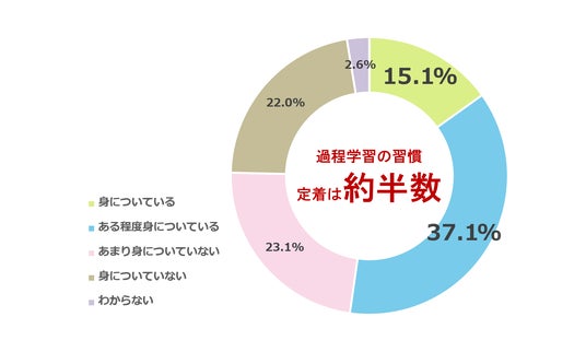 家庭学習を行う習慣が身についていると思うか尋ねたところ、52.2%が「身についている」(身についている:15.1%、ある程度身についている:37.1%)と回答しました。一方で、45.1%が「身についていない」(身についていない:22.0%、あまり身についていない:23.1%)という結果になりました。習慣化できている家庭と、まだ定着しきっていない家庭がほぼ拮抗する結果となっており、家庭ごとに学習習慣の定着状況に差がある様子がうかがえます。