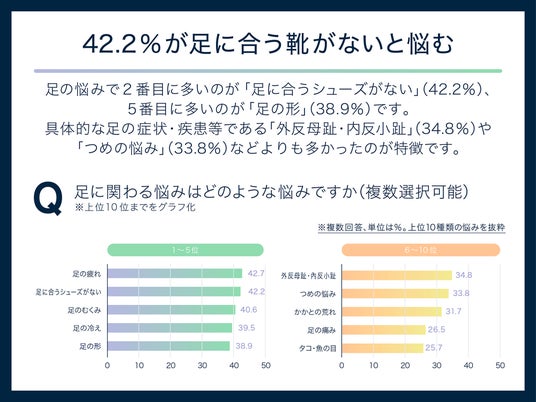 「足に関わる悩みを持っていますか」という質問では、95.4%の人が「持っている」と回答しました。このうち、その悩みが何歳代から始まったのかを質問したところ、63.4%の人が10代や20代からでした。また、悩みの種類を質問したところ、トップ5は「足の疲れ」(42.7%)、「足に合うシューズがない」(42.2%)、「足のむくみ」(40.6%)、「足の冷え」(39.5%)、「足の形」(38.9%)でした。
