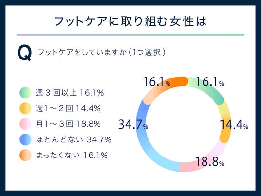 一方、足から健康を考える際、自分の足に合ったシューズ選びとともに、美容や健康維持の一環としてフットケアも重要になってきます。「フットケアをしていますか」という質問に対しては計49.3%、約2人に1人が何らかのフットケアを行っていると回答しました。