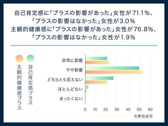また、フットケアを行うことで自己肯定感にプラスの影響があったと回答した人は計71.1%で、健康的だと感じる人は計76.8%でした。
