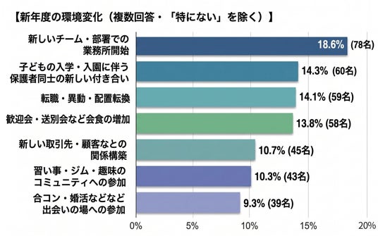 新年度に経験した、または経験しそうな環境変化を尋ねたところ、約5割(48.2%・202名)が何らかの新しい出会いや環境変化を経験していることがわかりました。具体的には、「新しいチーム・部署での業務開始」18.6%(78名)、「子どもの入学・入園に伴う保護者同士の新しい付き合い」14.3%(60名)、「転職・異動・配置転換」14.1%(59名)が上位となりました。仕事上の変化に加え、プライベートでも新しい人間関係が始まる時期であることが見て取れます。