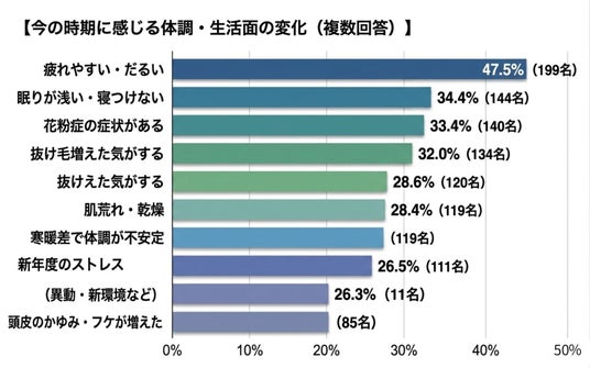 春の体調変化、「疲れやすい」47.5%が最多──「抜け毛が増えた」3割超も