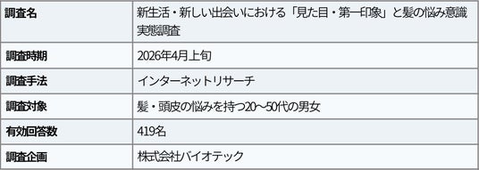 総合毛髪ケア事業を展開する株式会社バイオテックは、髪・頭皮の悩みを持つ20~50代の男女419名を対象に「新生活・新しい出会いにおける“見た目・第一印象”と髪の悩み意識 実態調査」を実施いたしました。