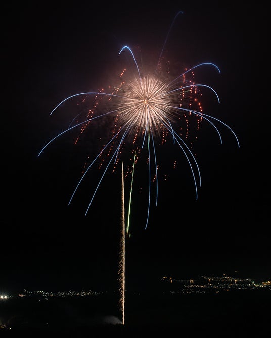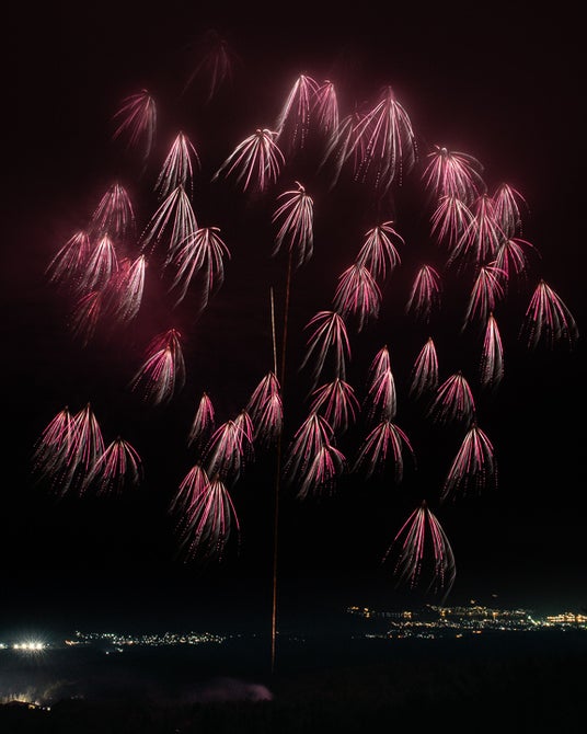朝の白さ、昼の強さ、夕の朱、夜の蒼。時間とともに移ろいゆく“光の変遷”を、鮮やかな色彩を特徴とする“磯谷煙火店”が、花火で表現。