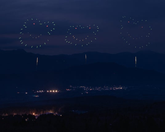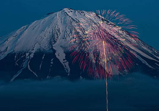 青く沈む富士の稜線。夜の気配が山肌を包み込み、空にはひとつ、またひとつと星が灯る。花火業界のトップランナー・紅屋青木煙火店が、富士の青き稜線を照らし煌めく星々の光を、美しく花火で表現。