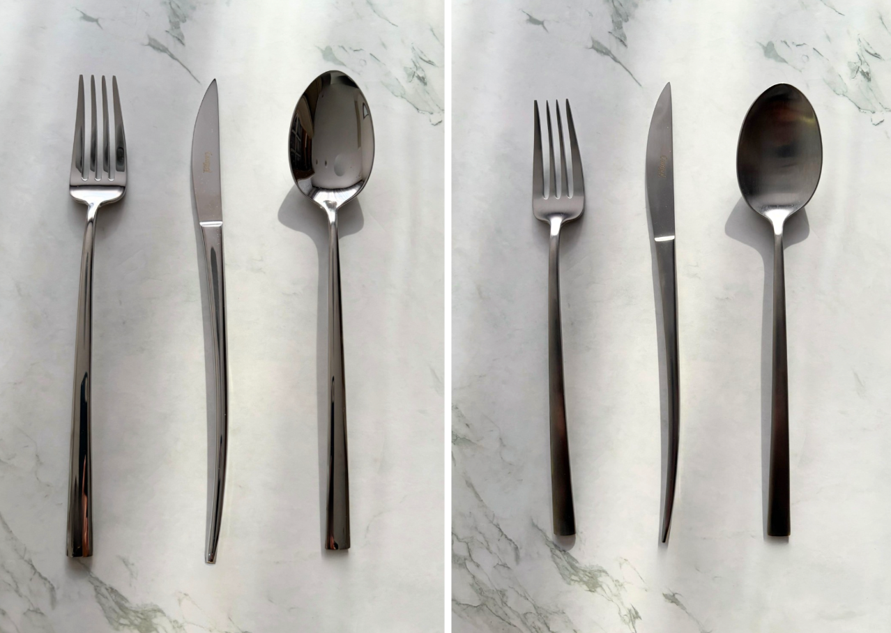 ALMAシリーズは、“ミラー”と“マットシルバー”の2タイプをご用意。光沢の輝きを放つミラーは、そこにあるだけで食卓を華やかに演出してくれます。また、職人により丁寧にヘアライン加工されたマットシルバーは、シンプルな上質さで魅せてくれます。めっきタイプのご対応も可能です。