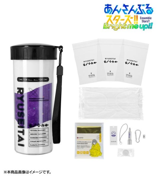 ユニット名やメンバー名をあしらったボトルに、ホイッスルやライトなどの計6種類の防災グッズを詰め込みました。