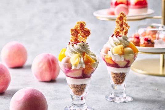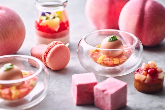ペストリーシェフのシグネチャーメニューとしておすすめするのは、レモングラスの清涼感とピーチソルベが溶け合う「スイートミネストローネ 桃 & レモングラス」と、ホワイトチョコレートとピーチクリームが織りなす「ピーチ&チェリージャム マカロン」。それぞれが素材の個性を繊細に引き立てながら、桃の新たな表情を引き出す一品です。