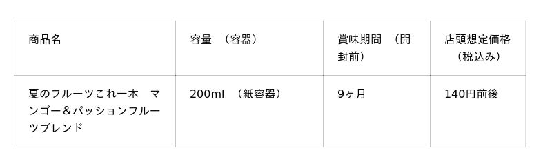 このたび、新発売する「夏のフルーツこれ一本 マンゴー&パッションフルーツブレンド」は、夏にぴったりなトロピカルな味わいです。マンゴーやパッションフルーツ等の7種類の果実をブレンド。マンゴーやパッションフルーツの甘酸っぱさを楽しみながら、たっぷりビタミンC・B2・Eや果実のミネラル(カリウム)が摂れる夏限定の100%果実ミックスジュースです。また、1日分の果実※1を使用し、砂糖不使用で健康志向の方にもおすすめです。