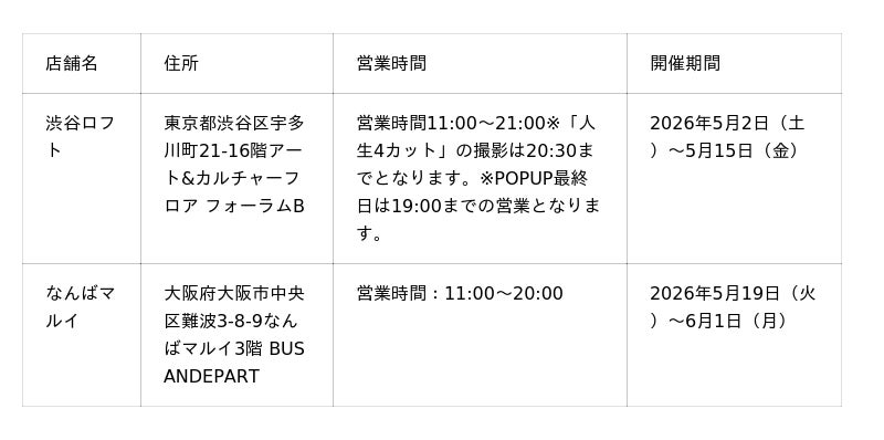 本ポップアップストアでは、ここでしか手に入らないオリジナルグッズの販売に加え、限定ノベルティの配布など、ファンの皆様にお楽しみいただけるコンテンツをご用意しております。さらに、同ブース内に設置される「人生4カット」では、nævisのオリジナルコラボフレームが登場し、特別な撮影体験をお楽しみいただけます。