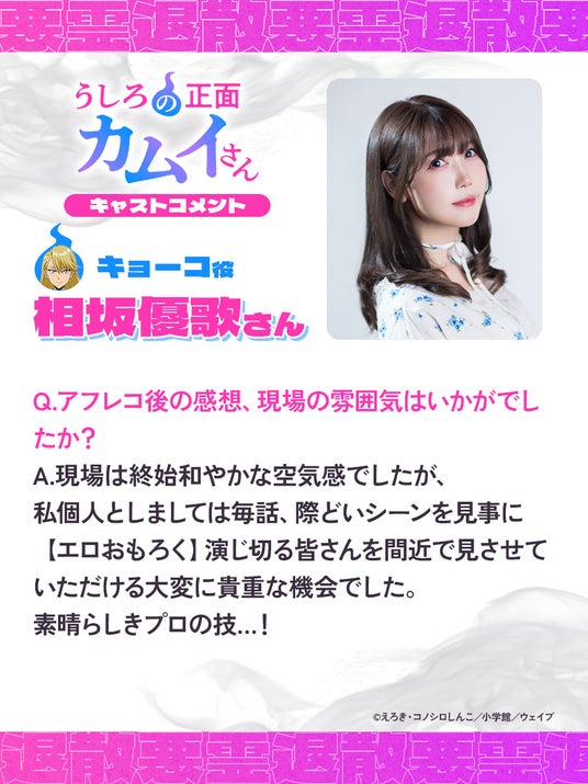 株式会社ウェイブ(本社:東京都豊島区、代表取締役社長:関口航太)が展開するアニメーションレーベル「デレギュラ」は、TVアニメ『うしろの正面カムイさん』に関する新たな情報を公開いたします。
