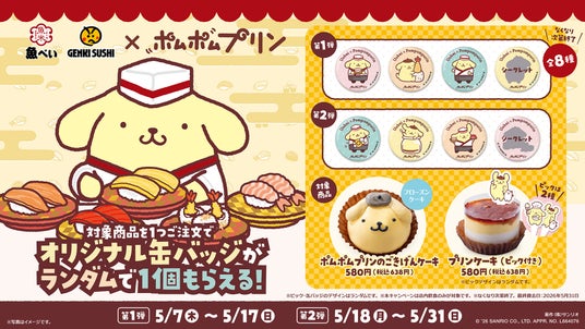 レストランチェーンを展開する株式会社Genki Global Dining Concepts(本社:東京都台東区 代表 取締役社長執行役員 藤尾益造)は、株式会社サンリオの人気キャラクター「ポムポムプリン」とのコラボレーションキャンペーンを、全国の魚べい・元気寿司にて2026年5月7日(木)より実施いたします。