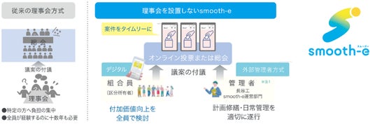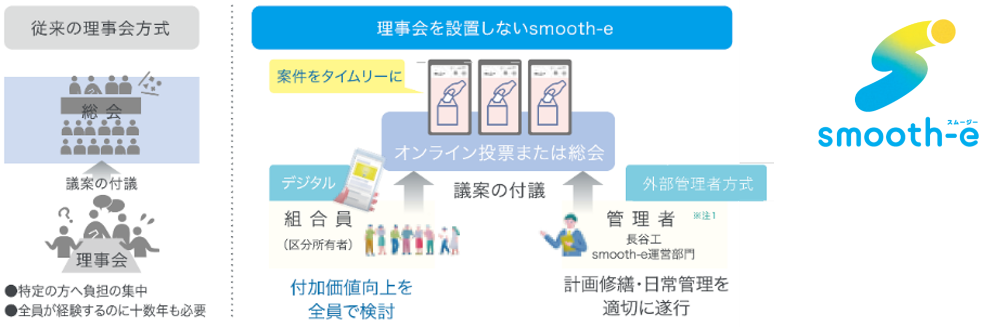 理事会を設置しない「外部管理者方式」を採用し、デジタル技術を活用したマンション管理サービス「smooth-e(スムージー)」を導入します。従来の理事会方式では居住者の中から理事を選出し管理運営に携わりますが、「smooth-e」では株式会社長谷工コミュニティ(本社:東京都港区、代表取締役社長:高木 丈彦)が管理者となり、居住者に代わって日常管理など専門的な業務を行います。居住者はパソコンやスマートフォンを使って気軽にマンション管理に関わることができます。