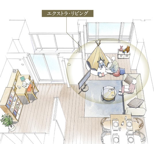 ※掲載の完成予想イラストは設計図書を基に描き起こしたもので、実際とは多少異なる場合がございます。設備機器等は一部省略または簡略化しております。各部材等につきましては、実際と質感・色等の見え方が異なる可能性があります。また、今後変更になる場合があります。家具・調度品等は販売価格に含まれておりません。
