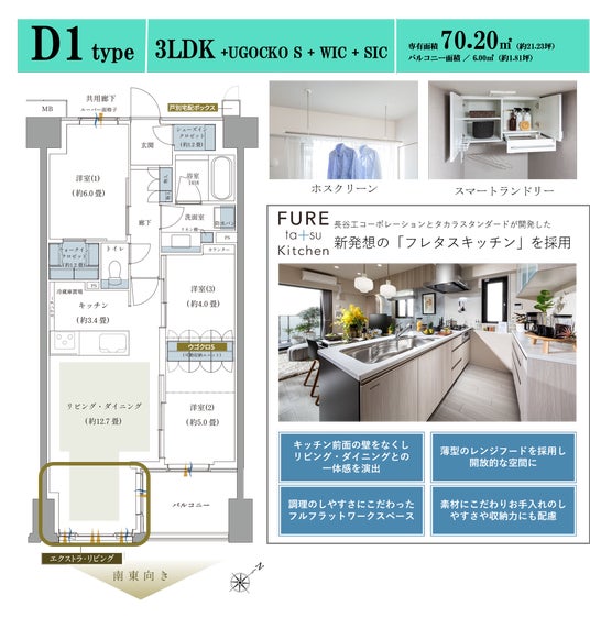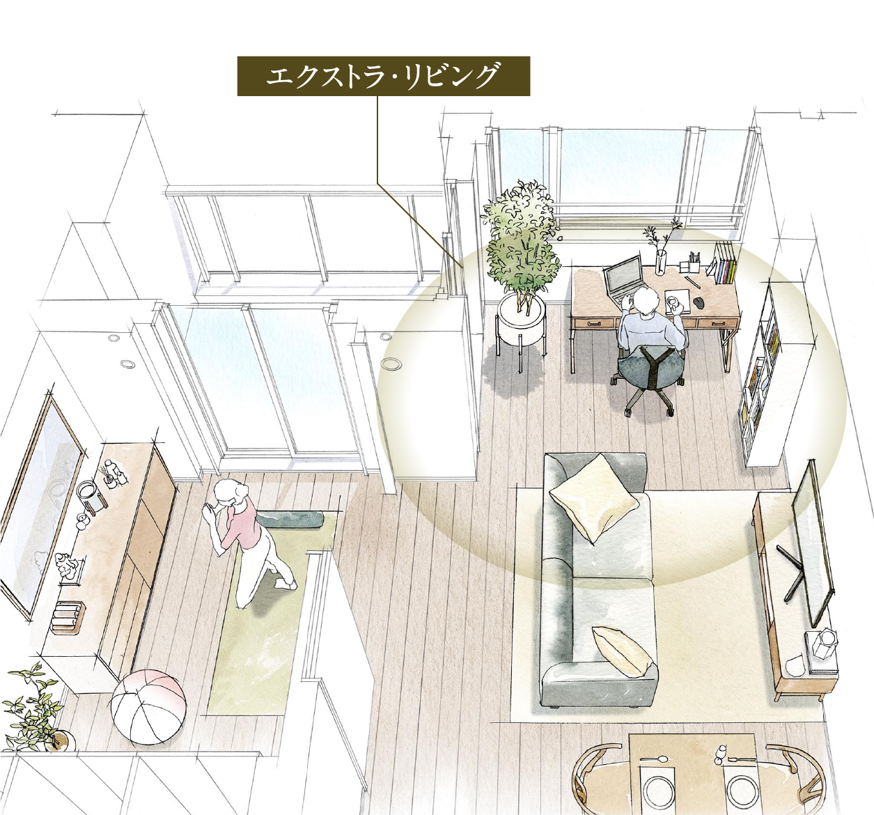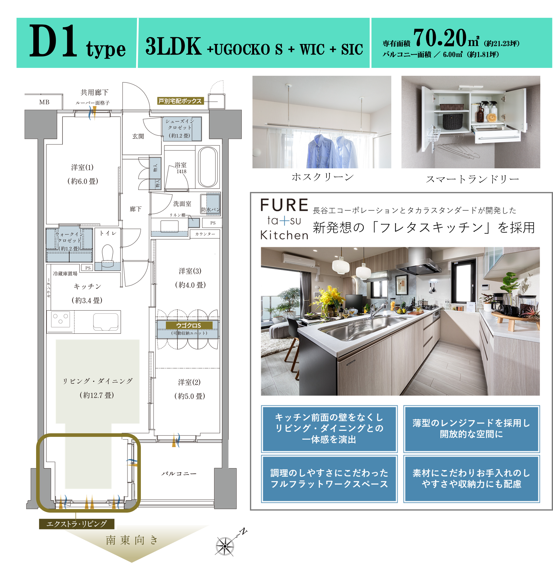 2LDK 58.47平方メートル ~4LDK 80.10平方メートル まで全12タイプのプランバリエーションをご用意しました。一部住戸に室内物干しができる「ホスクリーン」、お客様の「あったらいいな」をカタチにした長谷工グループオリジナル仕様「U’s+(ユーズプラス)」から、全住戸に「スマートランドリー」を採用しました。キッチンには長谷工コーポレーションとタカラスタンダードが共同開発したリビングの一体感を高める新発想の「フレタスキッチン」を導入しました。さらに一部住戸にはリビングの一角に「エクストラ・リビング」を設け、ワークスペースやキッズスペースなど多目的に活用できます。