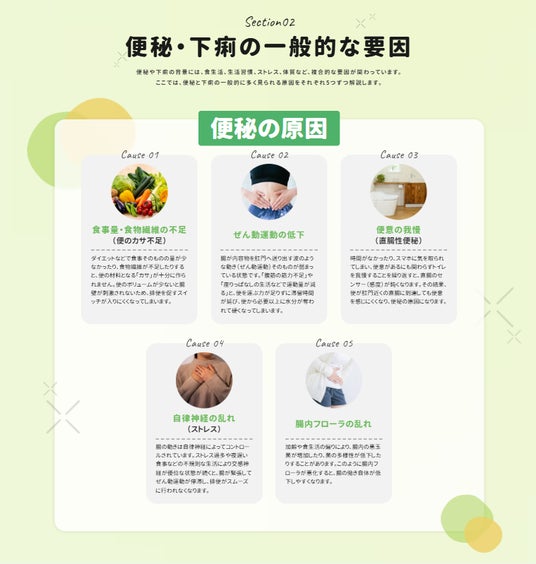 便秘や下痢には、食生活、生活習慣、ストレス、体質など複数の要因が関わります。自身の症状に関連しやすい一般的な原因を確認できます。