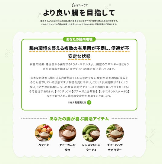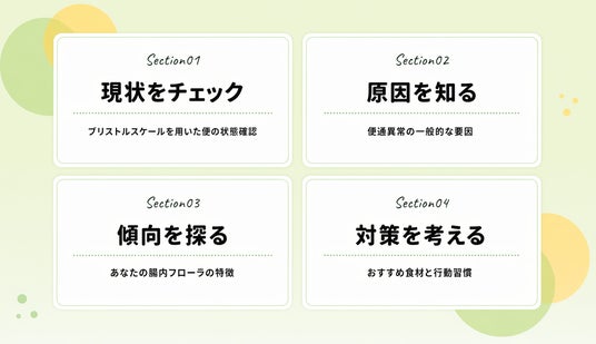 本コンテンツは、便通乱れに悩む人が自分の状態を知り、腸内フローラ検査結果を踏まえて、自分に合った対策を見つけるための4ステップで構成されています。