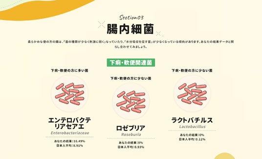 腸内フローラ検査の結果をもとに、同じような不調を抱える人に共通して多い菌・少ない菌など、自身の腸内細菌の傾向を確認できます。