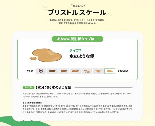 便の形状を7段階に分類する世界的な指標「ブリストルスケール」を用いて、現在の便の状態を確認します。