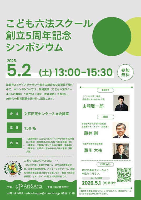 ベストセラー『こども六法』(弘文堂)をはじめ12冊超の児童実用書を刊行し、子どもの法教育を牽引してきた山崎聡一郎氏が主宰する「こども六法スクール(運営:株式会社Art&Arts)」は、設立5周年を記念したシンポジウムを2026年5月2日(土)、東京・文京区で開催します。