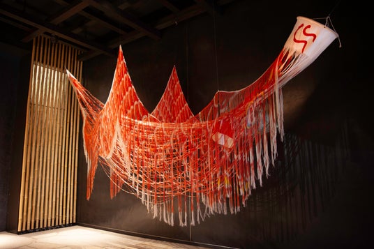 日本ではこどもの日に健やかな成長を願い掲げられ、初夏の空を彩る風景として親しまれてきた「こいのぼり」。新緑の季節にあわせて展示される本作品は、実際に空を泳いでいた「こいのぼり」を素材として用い、繊細な一本の糸になるまで分解し、風や人の動静、日差しや空間の移ろいによって揺れ動く、「気配」をまといます。カペラ京都では、アート作品の展示を通じ日本文化を新たな視点からご紹介し、滞在の時間に新たな奥行と余韻を提供いたします。