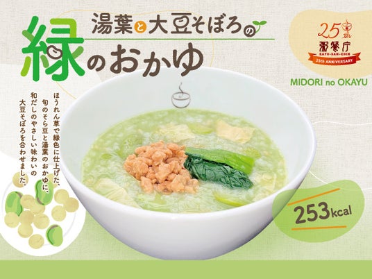 今回、感謝を込めてお届けする25周年記念企画の第2弾『湯葉と大豆そぼろの緑のおかゆ』は、復刻を期待する声が特に多い人気のおかゆを掛け合わせた、節目にふさわしいコラボレーションメニュー。ほうれん草を使用した鮮やかな緑色のおかゆに、植物性タンパク質が豊富な旬のソラマメと食感もたまらない湯葉、さらに美容に良い食事として注目される大豆ミートをだしと合わせ、和テイストに仕上げました。それぞれの素材のうまみを生かし、からだにやさしく、253kcalと低カロリーながらしっかりとした食べ応えも感じられるやさしい一杯です。