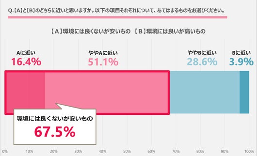 また、「環境には良くないが使い勝手が良いもの」と「環境には良いが使い勝手が悪いもの」のどちらを選ぶか調査したところ、前者に近い人が約8割を占める結果となりました。食品や商品購入時、環境配慮よりも「価格」や「使い勝手」を優先する傾向が見られました。
