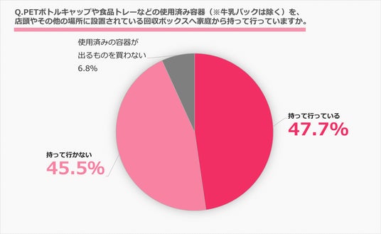 ・使用済み容器回収ボックスの利用率向上のカギは、設置場所とインセンティブ使用済み容器を回収ボックスへ持参するかを調査したところ、「持って行っている」と「持って行かない」という回答がほぼ半数に割れる結果となりました。