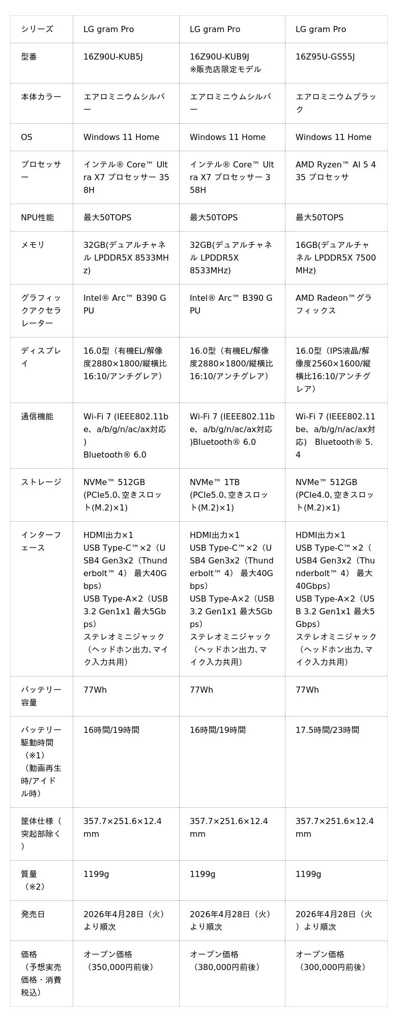 LGエレクトロニクス・ジャパン株式会社(代表取締役:孫 成周(ソン・ソンジュウ) 本社:東京都中央区)は、高性能かつ壮観な大画面を軽快に持ち運べるフラッグシップモバイルノートパソコンシリーズ「LG gram Pro」において、有機ELディスプレイを搭載した2モデルをはじめとする計3モデルを、本日2026年4月28日(火)より発売します。