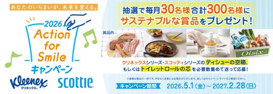 日本製紙グループの日本製紙クレシア株式会社〔住所:東京都千代田区神田駿河台4-6、代表取締役社長:安永敦美〕は、使用後の『クリネックス』や『スコッティ』ブランドのティシューの空箱、もしくはトイレットロールの芯を必要数集めて応募できる「Action for Smile(アクション フォー スマイル)キャンペーン2026」を、2026年5月1日(金)より実施します。
