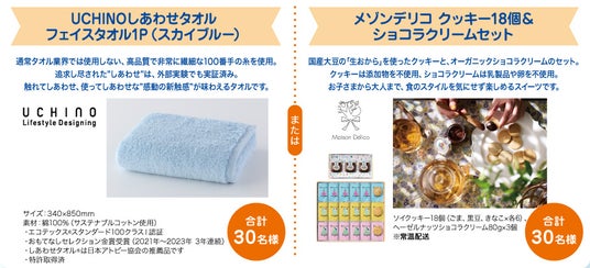 UCHINOしあわせタオル フェイスタオル1P (スカイブルー)または メゾンデリコ クッキー18個&ショコラクリームセット
