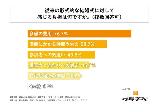 結婚を検討・保留している20代~30代の男女の約7割が、従来の形式的な結婚式に対して何らかの負担を感じている