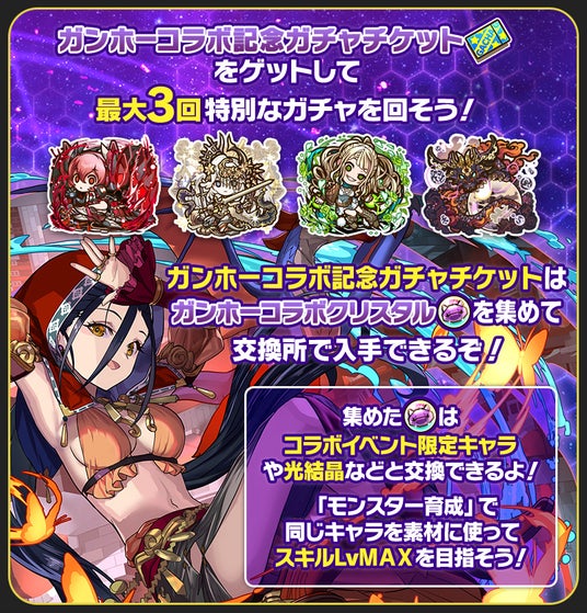 「コラボガチャ ガンホーコラボ」に新登場する「カゲロウ:ホムラ」や「東魔王オリエンス」「正掟神・テミス」「黒熾龍・ゴウテン」などを手に入れるチャンスです。