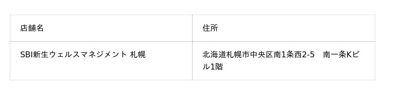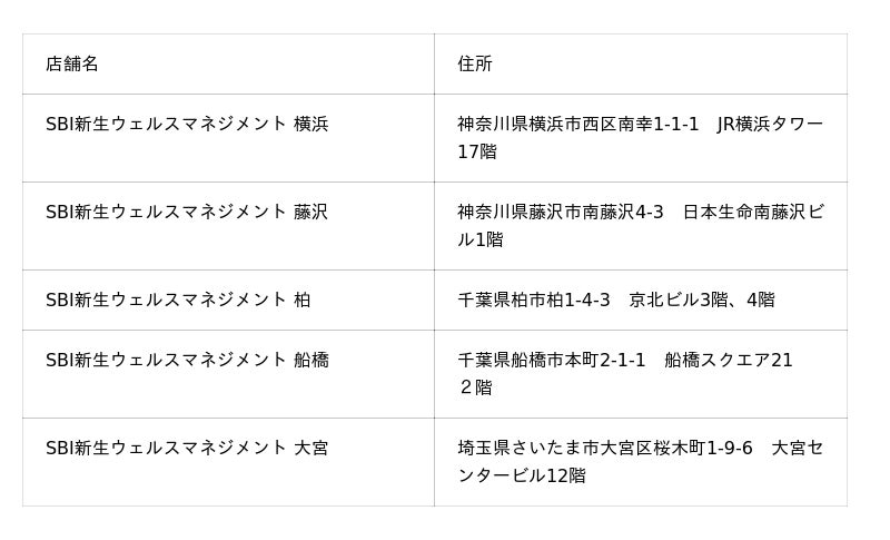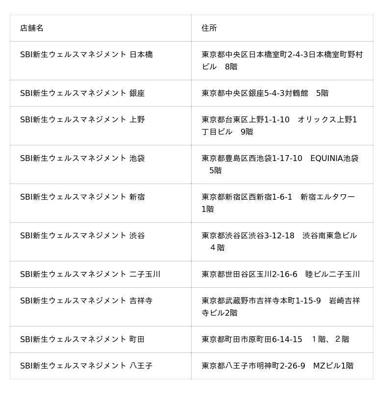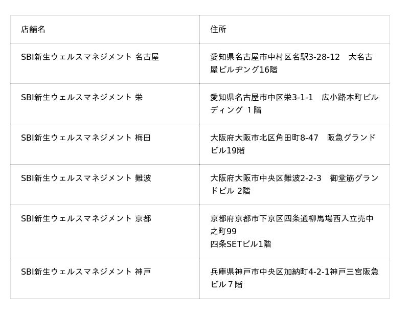 <SBI新生ウェルスマネジメント 店舗一覧>(営業時間は、いずれも平日 9:00~17:00)