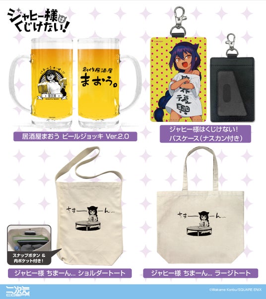 アクリルスタンドやビールジョッキ、トートバッグなどさまざまな「ジャヒー様」グッズが二次元コスパから新登場。