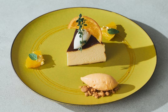 とろけるような口どけの濃厚バスクチーズケーキを、ほのかな塩味を効かせたマスカルポーネバニラクリームとともに。自家製オランジェットの食感と、オレンジアイスの爽快さが、濃厚な味わいに鮮やかな彩りを添えます。