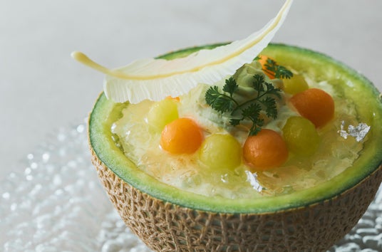 メロンを器に仕立てた、初夏の光をまとう季節のパルフェです。瑞々しい2種のメロン果肉を主役に、清涼なサイダーのジュレと柔らかな杏仁ミルクプリンが重なり合い、繊細なホワイトチョコの羽と銀箔が至高のひとときを華やかに彩ります。果実本来の甘みと香りをダイレクトに愉しむ一皿です。